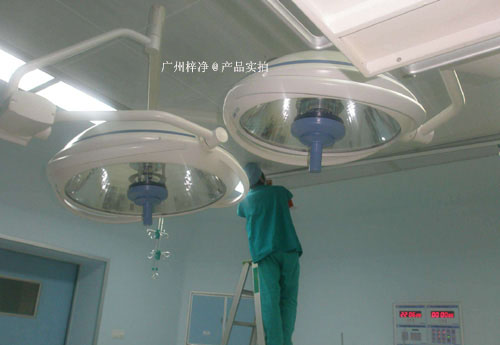 百級(jí)送風(fēng)天花阻尼層均流,采用鋁合金扣壓式裝配,不得使用螺釘裝配,以便于更換及維護(hù)。中間帶中速氣流補(bǔ)償裝置采用2.0mm厚的拉絲防銹鋁板制作,完全杜絕以前層流天花因?yàn)闊o影燈阻撓而中心位置氣流減弱而影響層流效果;進(jìn)口阻尼層流微孔均流送風(fēng)。潔凈層流手術(shù)室百級(jí)送風(fēng)天花安裝現(xiàn)場(chǎng)